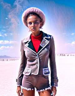 Sophisticated sensual tableaus, this portrait of katya clover wearing a dieselpunk clothes, at burning man festival in the desert, (candy cotton clouds:0.9),surreal, acid trip, magic mushrooms, lsd dmt candyflip, happy, joy, drunk, big eyes, crazy face,, elevates eroticism to aesthetic heights, every image a seducing sublime masterpiece.