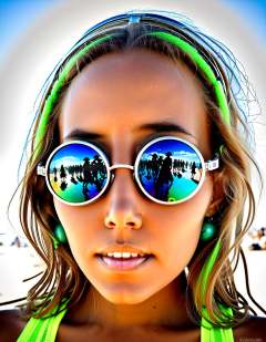 Hip-Hop Fashion katya clover wearing burning man burner fashion, at burning man festival in the desert, (candy cotton clouds:0.9),surreal, acid trip, magic mushrooms, lsd dmt candyflip, happy, joy, drunk, big eyes, crazy face, psychedelic, small brest flashing, natural face, black cylinder, Welding goggles, surreal sculptures as reflections on the goggles,,, Hip-Hop Fashion, often for music influence, bold accessories, or expressive attire.