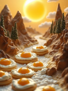 OBweisuo,This image is a highly detailed, hyper-realistic photograph of an artistic food arrangement that resembles a serene mountain landscape with a flowing river. The foreground features a series of cookies, each topped with a glossy, yellow-orange egg yolk and a white, fluffy egg white, resembling fried eggs. The cookies themselves are round, with a golden-brown hue and a slightly rough texture, mimicking the texture of a baked good.In the background, there are miniature, meticulously crafted pine trees and rocky cliffs, made from edible materials such as chocolate and fondant, creating a three-dimensional effect. The river, flowing through the scene, is constructed from a white, fluffy substance, possibly marshmallow or meringue, giving it a soft, cloud-like appearance.The lighting in the image is warm and soft, casting a golden glow that enhances the natural colors of the scene. The background includes a large, yellow-orange orb, likely a representation of the sun, which adds to the overall serene and dreamy atmosphere. The composition is balanced, with the foreground and background elements working together to create a cohesive, visually striking scene that blends fantasy and reality in a culinary art form.