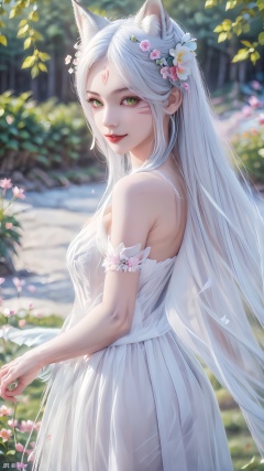 1girl,animal ears,solo,green eyes,breasts,long hair,dress,facial mark,white hair,flower,blurry background,hair ornament,looking at viewer,white dress,hair flower,blurry,tail,animal ear fluff,jewelry,fox ears,bracelet,lips,pink flower,smile,from side,bare shoulders,wolf ears,closed mouth,forehead mark,<lora:girl xiaobai_20240912002955:0.8>,
