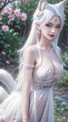 1girl,animal ears,solo,green eyes,breasts,long hair,dress,facial mark,white hair,flower,blurry background,hair ornament,looking at viewer,white dress,hair flower,blurry,tail,animal ear fluff,jewelry,fox ears,bracelet,lips,pink flower,smile,from side,bare shoulders,wolf ears,closed mouth,forehead mark,<lora:girl xiaobai_20240912002955:0.8>,