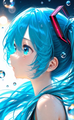 (masterpiece),(best quality),illustration,ultra detailed,hdr,Depth of field,(colorful),nai3 Style,1girl,solo,hatsune miku,long hair,twintails,tears,from side,profile,crying,bare shoulders,aqua eyes,bubble,portrait,blue hair,hair ornament,crying with eyes open,blurry,blue eyes,aqua hair,hair between eyes,water drop,closed mouth,sleeveless,upper body,