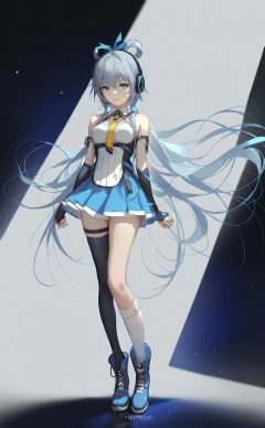 masterpiece,best quality,high quality,(colorful),[Artist sk (askzy)],[Artist wlop],Artist SHC,1girl,Luo Tianyi (Vocaloid),solo,green eyes,asymmetrical legwear,long hair,single kneehigh,single sock,smile,hair rings,thighhighs,necktie,skirt,uneven legwear,single thighhigh,very long hair,looking at viewer,boots,socks,nail polish,full body,gloves,grey hair,mismatched legwear,bare shoulders,elbow gloves,pleated skirt,detached sleeves,kneehighs,breasts,headphones,sleeveless,standing,blue skirt,sidelocks,asymmetrical footwear,hair between eyes,blue footwear,