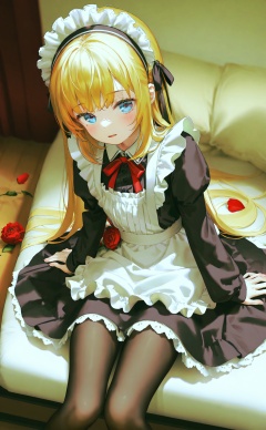 masterpiece,best quality,illustration,ultra detailed,hdr,Depth of field,(colorful),[Artist chen bin],[iumu],Artist roha,1girl,solo,long hair,rose,maid,blonde hair,maid headdress,flower,looking at viewer,red flower,apron,red rose,pantyhose,maid apron,dress,blush,petals,long sleeves,black pantyhose,sitting,frills,parted lips,blue eyes,black dress,white apron,rose petals,indoors,open mouth,