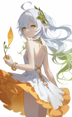 masterpiece,best quality,high quality,(colorful),[Artist sk (askzy)],[Artist wlop],Artist taya oco,solo,1girl,dress,long hair,green eyes,pointy ears,white dress,looking at viewer,smile,white background,white hair,cross-shaped pupils,multicolored hair,nahida (genshin impact),bare shoulders,green hair,simple background,braid,very long hair,holding,leaf hair ornament,backless outfit,symbol-shaped pupils,closed mouth,breasts,bracelet,gradient hair,hair between eyes,jewelry,backless dress,leaf,from behind,ahoge,bare back,hair ornament,