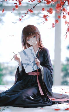 (masterpiece),(best quality),illustration,ultra detailed,hdr,Depth of field,(colorful),[Artist:wlop],[[Artist:sheya]],Artist:hiten_(hitenkei),mmd,hanfu,1girl,solo,long hair,dress,branch,holding,looking at viewer,feathers,brown hair,long sleeves,black dress,head tilt,parted lips,closed mouth,flower,grey eyes,sitting,shawl,smile,cover,artist name,
