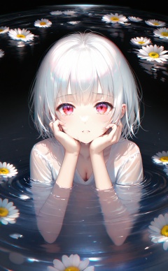 (masterpiece),(best quality),illustration,ultra detailed,hdr,Depth of field,(colorful),(chromatic aberration),(beautiful young female:1.4),(streaming tears),sad,(daisy),(daisy),(daisy),looking at viewer,partially submerged,both hands on own cheek,{see-through long shirt},{no bra},(white hair, short hair, bangs:1.2),(glowing eyes),ripples,dark water,black background,(prismatic),