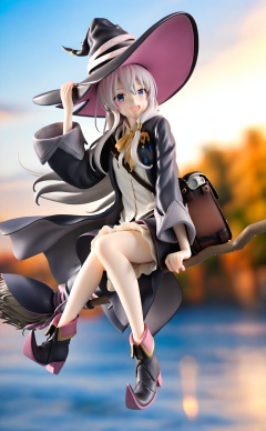 masterpiece,best quality,illustration,ultra detailed,hdr,Depth of field,(colorful),PVC Style,1girl,broom riding,hat,broom,elaina (majo no tabitabi),solo,long hair,witch hat,shirt,black headwear,white shirt,hand on headwear,sidesaddle,open mouth,black footwear,skirt,witch,smile,bow,bag,grey hair,long sleeves,blurry,outdoors,collared shirt,black skirt,hair between eyes,looking at viewer,wide sleeves,pointy footwear,robe,blurry background,sky,grey eyes,:d,bowtie,white hair,boots,full body,open clothes,depth of field,yellow bow,blush,blue eyes,