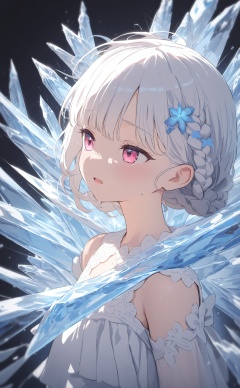 (masterpiece),(best quality),illustration,ultra detailed,hdr,Depth of field,(colorful),loli, wlop,1 girl,loli,White Dress,White short hair,braids,lily flower hair clip,upper body,cry,water,black background,Ice crystal,dappled sunlight,Suspended colorless crystal,beautiful detailed glow, (detailed ice), beautiful detailed water