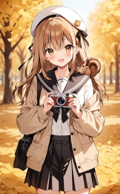 (masterpiece), (best quality), illustration, ultra detailed, hdr, Depth of field, (colorful),Artist weri, 1girl, skirt, holding, smile, long hair, solo, bangs, hat, brown eyes, pleated skirt, camera, holding camera, long sleeves, school uniform, :d, black skirt, sailor collar, looking at viewer, serafuku, squirrel, blush, open mouth, bag, animal, beret, leaf, open clothes, shirt, autumn leaves, blurry, white shirt, brown hair, animal on shoulder, white headwear, ribbon, black bow, hair ribbon, black ribbon, blurry background, hair between eyes, bow, outdoors, cardigan, ginkgo leaf, autumn, puffy long sleeves, off shoulder, black sailor collar, cowboy shot, depth of field, open cardigan, standing, shoulder bag