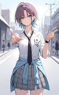 1girl, solo, asakura toru, looking at viewer, short hair, blue hair, brown hair, ahoge, multicolored hair, gradient hair, green eyes, school uniform, white shirt, gray skirt, pleated skirt, plaid skirt, wristband, earrings, black necktie, pocket, breast pocket, clothes around waist, sleeves rolled up, light blue jacket around waist, standing, pointing at viewer, outdoors, street, day, cowboy shot, masterpiece, bestquality, ultra detailed