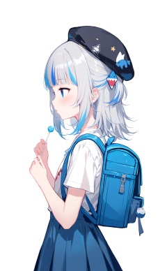masterpiece),(best quality),illustration,ultra detailed,hdr,Depth of field,(colorful),Artist:ask (askzy),[Artist:sheya],[Artist:chen bin],[Artist:wlop],Artist:hiten_(hitenkei),1girl,gawr gura,backpack,solo,virtual youtuber,bag,multicolored hair,hat,white background,blue eyes,streaked hair,simple background,white shirt,blue hair,food,shirt,short sleeves,lollipop,beret,candy,holding,profile,black headwear,grey hair,white hair,upper body,holding food,medium hair,skirt,blush,hair ornament,