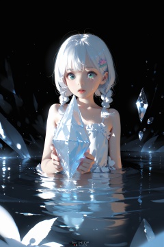 (masterpiece),(best quality),illustration,ultra detailed,hdr,Depth of field,(colorful),loli,wlop,1 girl,loli,White Dress,White short hair,braids,lily flower hair clip,upper body,cry,water,black background,Ice crystal,dappled sunlight,Suspended colorless crystal,beautiful detailed glow,(detailed ice),beautiful detailed water,