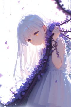 (masterpiece),(best quality),illustration,ultra detailed,hdr,Depth of field,(colorful),loli,white background,Dundar effect,a lot of purple vines,vines covering half of the painting,delicate plant details,a girl,girl,petite girl,long white hair,golden pupils,white dress,bare feet,side,side,upper body,head up,sad eyes,rain,light,figure light,petals,purple filter,left,fog,dream,unreal,Blur,float light,