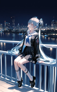 (masterpiece),(best quality),illustration,ultra detailed,hdr,Depth of field,(colorful),[pottsness],[iumu],[Sheya],Artist bzmfbgdm,1girl,Luo Tianyi (Vocaloid),solo,long hair,skirt,school uniform,socks,sitting,jacket,night,looking up,very long hair,pleated skirt,shoes,sky,black footwear,blue eyes,black skirt,bow,shirt,white shirt,kneehighs,serafuku,night sky,open clothes,twintails,hair ornament,black jacket,open jacket,cityscape,ribbon,bangs,railing,