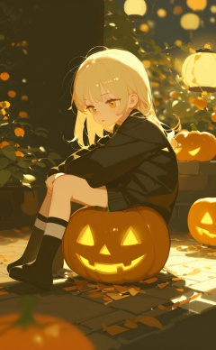 masterpiece,best quality,illustration,ultra detailed,hdr,Depth of field,(colorful),artist:ciloranko,artist:chenbin,artist:tianliang duohe fangdongye,bright outline,,1girl, solo, long_hair, blonde_hair, sitting, socks, pumpkin, lantern