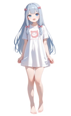 masterpiece, bestquality, Izumi Sagiri, 1girl, solo, long hair, looking at viewer, smile, open mouth, blue eyes, shirt, bow, blue hair, standing, full body, white shirt, short sleeves, hair bow, grey hair, barefoot, pink bow, t-shirt,