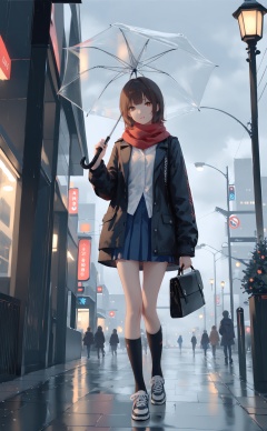 (masterpiece),(best quality),illustration,ultra detailed,hdr,Depth of field,(colorful),loli,[Artist:wlop],Artist:hiten_(hitenkei),[[Artist:sheya]],umbrella,scarf,holding umbrella,rain,skirt,outdoors,holding,1girl,red scarf,brown hair,bag,sky,blue skirt,night,pleated skirt,shoes,socks,coat,sneakers,looking at viewer,short hair,shirt,brown eyes,1boy,transparent,transparent umbrella,city,building,open clothes,standing,cloud,walking,long sleeves,white shirt,cloudy sky,jacket,parted lips,sign,miniskirt,shoulder bag,lamppost,open coat,solo focus,full body,road sign,