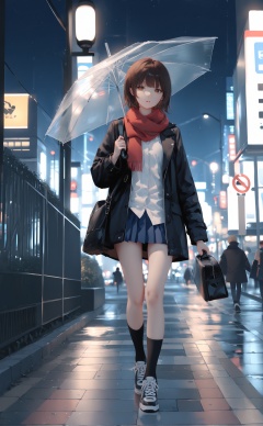 (masterpiece),(best quality),illustration,ultra detailed,hdr,Depth of field,(colorful),loli,[Artist:wlop],Artist:hiten_(hitenkei),[[Artist:sheya]],umbrella,scarf,holding umbrella,rain,skirt,outdoors,holding,1girl,red scarf,brown hair,bag,sky,blue skirt,night,pleated skirt,shoes,socks,coat,sneakers,looking at viewer,short hair,shirt,brown eyes,1boy,transparent,transparent umbrella,city,building,open clothes,standing,cloud,walking,long sleeves,white shirt,cloudy sky,jacket,parted lips,sign,miniskirt,shoulder bag,lamppost,open coat,solo focus,full body,road sign,