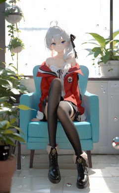 masterpiece,best quality,illustration,ultra detailed,hdr,Depth of field,(colorful),[[[Artist wlop]]],[Artist chen bin],[Artist omone hokoma agm],Artist azuuru,elaina \(majo no tabitabi\),1girl,solo,thighhighs,long hair,blue eyes,sitting,black thighhighs,blurry foreground,ahoge,skirt,white hair,long sleeves,looking at viewer,shoes,window,smile,black skirt,collarbone,shirt,plant,closed mouth,hair between eyes,rain,blurry,boots,grey hair,ribbon,red jacket,knee up,off shoulder,jacket,chair,water drop,black footwear,full body,hair ribbon,