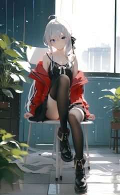 masterpiece,best quality,illustration,ultra detailed,hdr,Depth of field,(colorful),[[[Artist wlop]]],[Artist chen bin],[Artist omone hokoma agm],Artist azuuru,elaina \(majo no tabitabi\),1girl,solo,thighhighs,long hair,blue eyes,sitting,black thighhighs,blurry foreground,ahoge,skirt,white hair,long sleeves,looking at viewer,shoes,window,smile,black skirt,collarbone,shirt,plant,closed mouth,hair between eyes,rain,blurry,boots,grey hair,ribbon,red jacket,knee up,off shoulder,jacket,chair,water drop,black footwear,full body,hair ribbon,