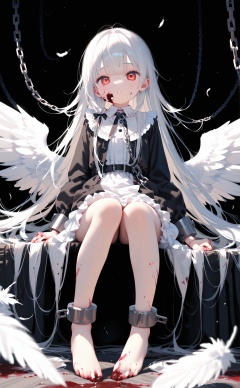 (masterpiece),(best quality),illustration,ultra detailed,hdr,Depth of field,(colorful),loli,1girl,solo,wings,blood,long hair,sitting,chain,red eyes,blood on hands,feathered wings,barefoot,blood on face,blood from eyes,dress,long sleeves,cuffs,feathers,frills,looking at viewer,very long hair,white wings,bandages,shackles,bangs,