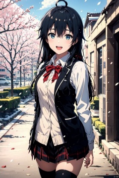 1girl,yukinoshita yukino,skirt,solo,long hair,black hair,school uniform,jacket,thighhighs,outdoors,sobu high school uniform,shirt,blue eyes,plaid skirt,ahoge,white shirt,smile,plaid,open mouth,black jacket,blazer,looking at viewer,black thighhighs,ribbon,cardigan,bow,pleated skirt,collared shirt,red bow,bangs,road,bowtie,long sleeves,:d,open clothes,red bowtie,hair between eyes,zettai ryouiki,tree,cowboy shot,street,red ribbon,blush,day,open jacket,雪之下雪乃