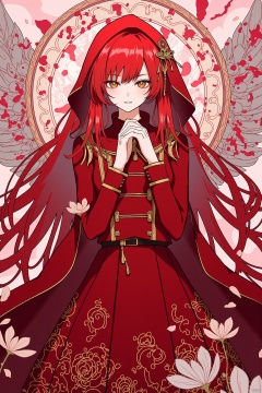 1girl,solo,dress,red hair,looking at viewer,long hair,red dress,red theme,flower,long sleeves,hood,full body,own hands together,abstract (abstract art),bangs,abstract background,hood up,