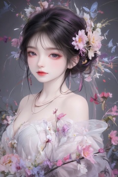 8K image.black hair,1girl, solo, long hair, looking at viewer, hair ornament, dress, holding, jewelry, purple eyes, upper body, purple hair, flower, hair flower, necklace, white dress, holding flower