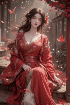 masterpiece,best quality,extremely high detailed,intricate,8k,HDR,wallpaper,cinematic lighting,(universe:1.4),Huge chest,,GF,火灵儿Flux-起风了,1girl, solo, long hair, breasts, brown hair, black hair, hair ornament, long sleeves, dress, cleavage, jewelry, flower, earrings, wide sleeves, petals, chinese clothes, bug, butterfly, stairs, falling petals