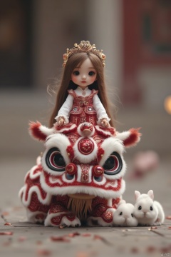 a porcelain doll, dressed in a red and white dress, sits atop a dragon-like creature. The creature, adorned with a large white face, is adorned with red accents. Its head is encircled by a large black circle, adding a touch of contrast to the scene. The doll's long, brown hair, and a brown crown, adds a pop of color to the otherwise monochromatic scene. Two small white rabbits are positioned to the right of the doll, while the rest of the scene is blurred in the background.,lion dance