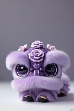 A close-up shot of a purple stuffed animal on a white surface. The animal has a large black eye in the center of its face. The eyes are large and round. The head of the animal is adorned with a purple hat that has three white flowers on top of it. The fur on the animal's head is thick and fluffy. The background is a solid gray color.