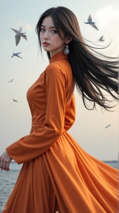 1girl, long hair, solo, jewelry, black hair, earrings, dress, orange dress, looking at viewer, wind, bird, long sleeves, looking back, standing, outdoors, parted lips