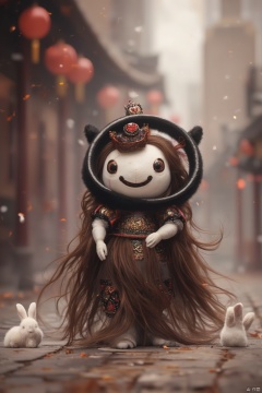 The creature, adorned with a large white face, is adorned with red accents. Its head is encircled by a large black circle, adding a touch of contrast to the scene. The doll's long, brown hair, and a brown crown, adds a pop of color to the otherwise monochromatic scene. Two small white rabbits are positioned to the right of the doll, while the rest of the scene is blurred in the background.,lion dance