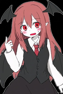 white skin,koakuma,1girl,head wings,bat wings,solo,red necktie,open mouth,black vest,white shirt,looking at viewer,simple background,blush,long sleeves,head_wings,bat_wings