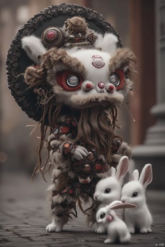 The creature, adorned with a large white face, is adorned with red accents. Its head is encircled by a large black circle, adding a touch of contrast to the scene. The doll's long, brown hair, and a brown crown, adds a pop of color to the otherwise monochromatic scene. Two small white rabbits are positioned to the right of the doll, while the rest of the scene is blurred in the background.,lion dance