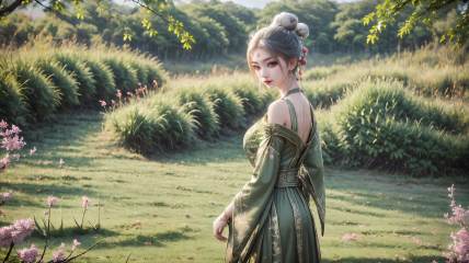 1girl,solo,hair bun,chinese clothes,green dress,dress,long sleeves,single hair bun,outdoors,nature,looking at viewer,from side,hair ornament,standing,grass,白发,<lora:girl miaojiangxiaobai_20240912173536:0.7>,