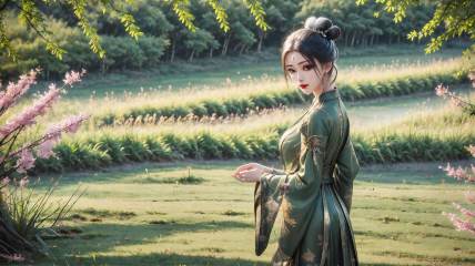 1girl, solo, hair bun, black hair, chinese clothes, green dress, dress, long sleeves, single hair bun, outdoors, nature, looking at viewer, from side, hair ornament, standing, grass<lora:girl miaojiangxiaobai_20240912173536:0.7>,