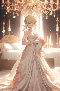 A serene Artoria Pendragon from Fate, adorned in a strapless white gown, cradles a white rabbit in her left hand as she stands before a pink-hued bed. A delicate white ribbon-trimmed shawl drapes across her arm. The soft glow of a chandelier casts a warm ambiance on the scene, illuminating the wreath of flowers on her head.