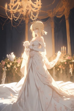A serene Artoria Pendragon from Fate, adorned in a strapless white gown, cradles a white rabbit in her left hand as she stands before a pink-hued bed. A delicate white ribbon-trimmed shawl drapes across her arm. The soft glow of a chandelier casts a warm ambiance on the scene, illuminating the wreath of flowers on her head.