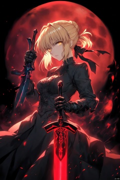 red moon on the sky,1girl, solo, breasts, looking at viewer, bangs, blonde hair, gloves, long sleeves, dress, ribbon, holding, medium breasts, hair ribbon, yellow eyes, weapon, sidelocks, sword, hair bun, holding weapon, black dress, glowing, holding sword, single hair bun, black background, serious, glowing weapon, glowing sword, excalibur morgan \(fate\), artoria pendragon \(fate\), saber alter