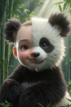 Human-Panda Chimera in a Bamboo Forest: An ultra close-up of a child-panda chimera with one side of the face showing a cute, chubby-cheeked human child with soft, round features and big, dark eyes, while the other side is panda-like, covered in fluffy black-and-white fur. The panda eye has a playful glint, with the characteristic black patch around it, blending seamlessly with the human side. The background is a lush bamboo forest, with beams of sunlight filtering through the tall, green stalks. The fur is rendered in a soft, touchable texture, with every detail of the bamboo leaves, and the gentle light, captured in vivid, hyper-detailed 3D, creating a heartwarming and endearing image.,FaDual
