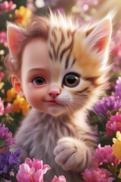 Human-Kitten Chimera in a Flower Garden: A close-up of a human-kitten chimera with one half of the face showing a tiny human child with big, innocent eyes and a small, button nose, while the other half is kitten-like, covered in soft, fluffy fur with tiny whiskers and a small, pink nose. The kitten eye is large and round, gleaming with curiosity. The background is a vibrant flower garden, with colorful blossoms in full bloom, and beams of sunlight creating a warm, inviting atmosphere. The fur, the delicate whiskers, and the petals of the flowers are all captured in vivid, hyper-detailed 3D, making the chimera irresistibly cute and lifelike,FaDual