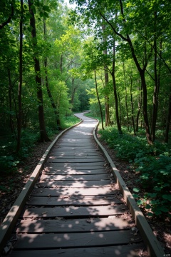A worn wooden plank road stretches across a rustic landscape, sunlight filtering through trees to cast dappled shadows on the path. Weathered planks creak beneath the weight of passing travelers, their footsteps echoing through the quiet woods. The camera captures a medium shot, framing the winding road amidst a sea of greenery.
