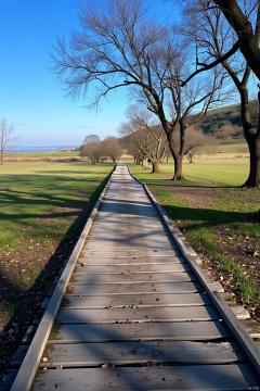 A rustic wooden plank road stretches across a sun-kissed meadow, weathered wood grain visible under a layer of worn earth and scattered leaves. The horizon stretches out before it, a gentle slope meeting the blue sky. A few trees stand sentinel along the way, their branches stretching towards the road like nature's own guardrails.