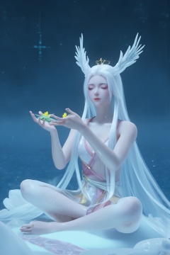 Chinese mature woman, sitting cross-legged on a white lotus throne, wearing a golden hat on her head, anime style appearance, white neon bra, white Hanfu, golden crown, eyes closed, girl, jewelry, long hair, white hair, cute, Hanfu, Dunhuang, hold out the hydrangeas with both hands, hold them tightly, look at the hug, look at the body, the cute little princess, Mrs. Dragon, wearing a pair of dragon horns on her head ((Masterpiece, best quality)),(( Well structured, well composed, luminous), translucent woman), tiny gold accents, beautiful and intricate details, ethereal light, whimsical imagining, art by Michif blue theme, off original, view ( beautiful),transparent,shiny_clothes,pink chest pleated skirt,white with yellow pimples,pink pimples,((water drops)),wet clothes,((beautiful details water)),(( Floating)), dynamic angle, ((beautiful details of the butterfly)), ((beautiful details of the stars)), ((slip dress)), particles, (beautiful details of the starry sky), (hazy fog), (beautiful Fragments) details), (((standing on the sea))), yellow belt, purple belt with white belt, light green belt,(big breasts:1.89),,(Pure blue sea:1.6),Xyuanyao