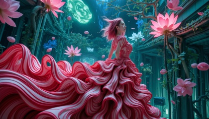 <lora:FL-bailing-24-0913ethereal flow10p:0.6>,bailing_ethereal_flow,ethereal harmony,the marbled dress blends in with the background,In a steampunk realm,a burst of vibrant crimson cascades,entwining around the limbs in a viscous allure. A young woman emerges from the shadows,depicted in a neo-expressionist masterpiece bathed in the embrace of raspberry syrup. The image features hyper-detailed 8K resolution with Octane rendering,showcasing exquisite depth of field and an ultra-wide perspective. The dynamic lighting creates amazing shadows with dramatic effects. The young woman has pink hair,and the background reveals glowing,color-changing lotus flowers in the night sky. Their petals flutter like fireflies within a green,blue,and purple flow of light. Above a towering complex of colorful buildings lies a vast tiered garden,connected by a beautiful arch bridge. Strange plants and animals thrive among the clouds,with branches,bamboo leaves,and brambles adding to the fantastical scene. Petals drift through the air,creating an enchanting and mysterious atmosphere.,