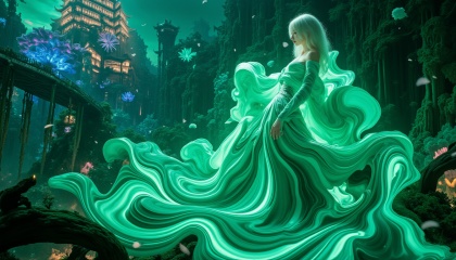 <lora:FL-bailing-24-0913ethereal flow10p:0.6>,bailing_ethereal_flow,ethereal harmony,the marbled dress blends in with the background,Create a cinematic image of a white-haired young woman emerging in a steampunk realm. Surround her with rich dark green light, swirling around her limbs with a viscous allure. The image should be depicted in a neo-expressionist style, with hyper-detailed 8K resolution and Octane rendering, showcasing exquisite depth of field and an ultra-wide perspective. Dynamic lighting should create amazing shadows and dramatic effects. The background reveals glowing, color-changing lotus flowers in the night sky, with petals fluttering like fireflies in a flow of green, blue, and purple light. Above a towering complex of colorful buildings lies a vast tiered garden connected by a beautiful arch bridge. Strange plants and animals thrive among the clouds, with branches, bamboo leaves, and brambles adding to the fantastical scene. Petals drift through the air, creating an enchanting and mysterious atmosphere.