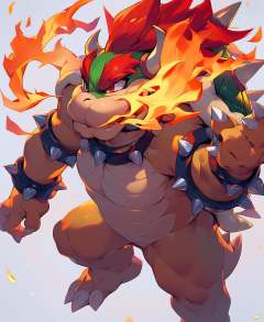 score_9, score_8_up, score_7_up, score_6_up, score_5_up, score_4_up, source_furry, hi res, side angle, rimlight, solo, Bowser, Spiked Bracelets, Spiked Collar, Spiky Shell, red eyes, focus, solo, fire, breathing fire
