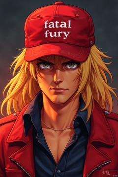 young man, terry bogard, wearing a red duckbill hat, with the words "fatal fury" printed on the front of the hat,头发扎起